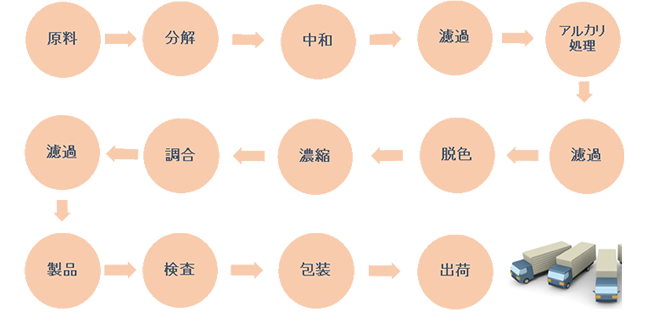 アミノ酸液は、動・植物由来のたんぱく質を原料とし、厳しい品質管理をクリアして作られています。